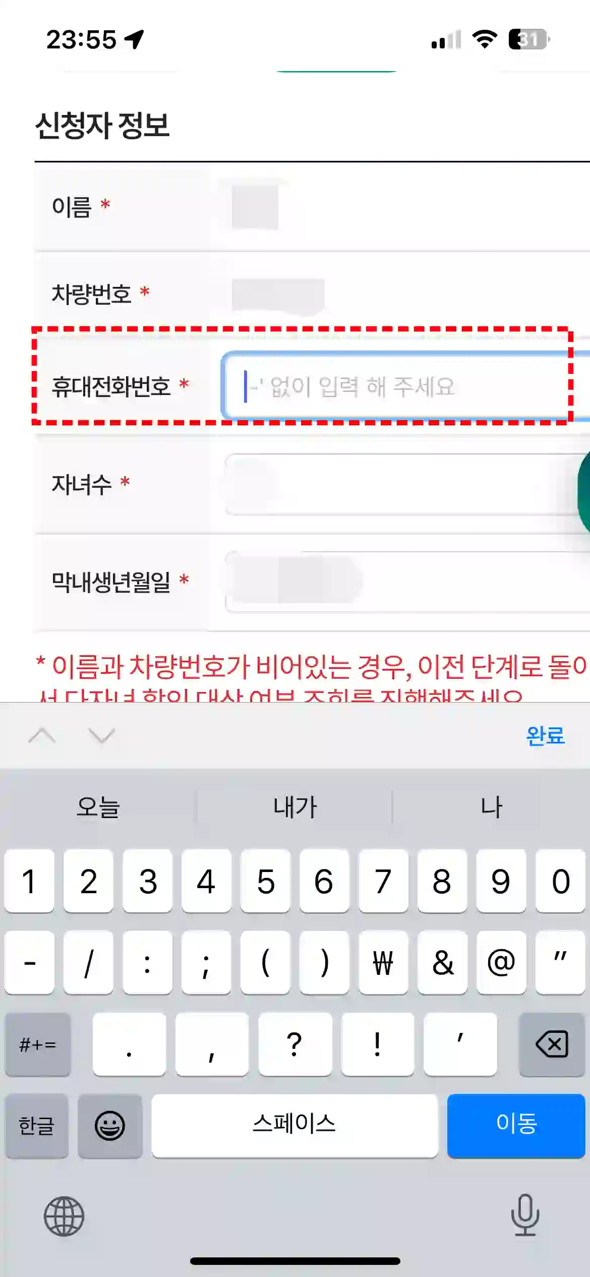 대상자 확인이 되었다면, 최종 신청자에 대한 정보를 입력하는 단계입니다. 아래 사진처럼 휴대전화 번호를 입력하고, 다음 단계로 넘어가도록 합니다.