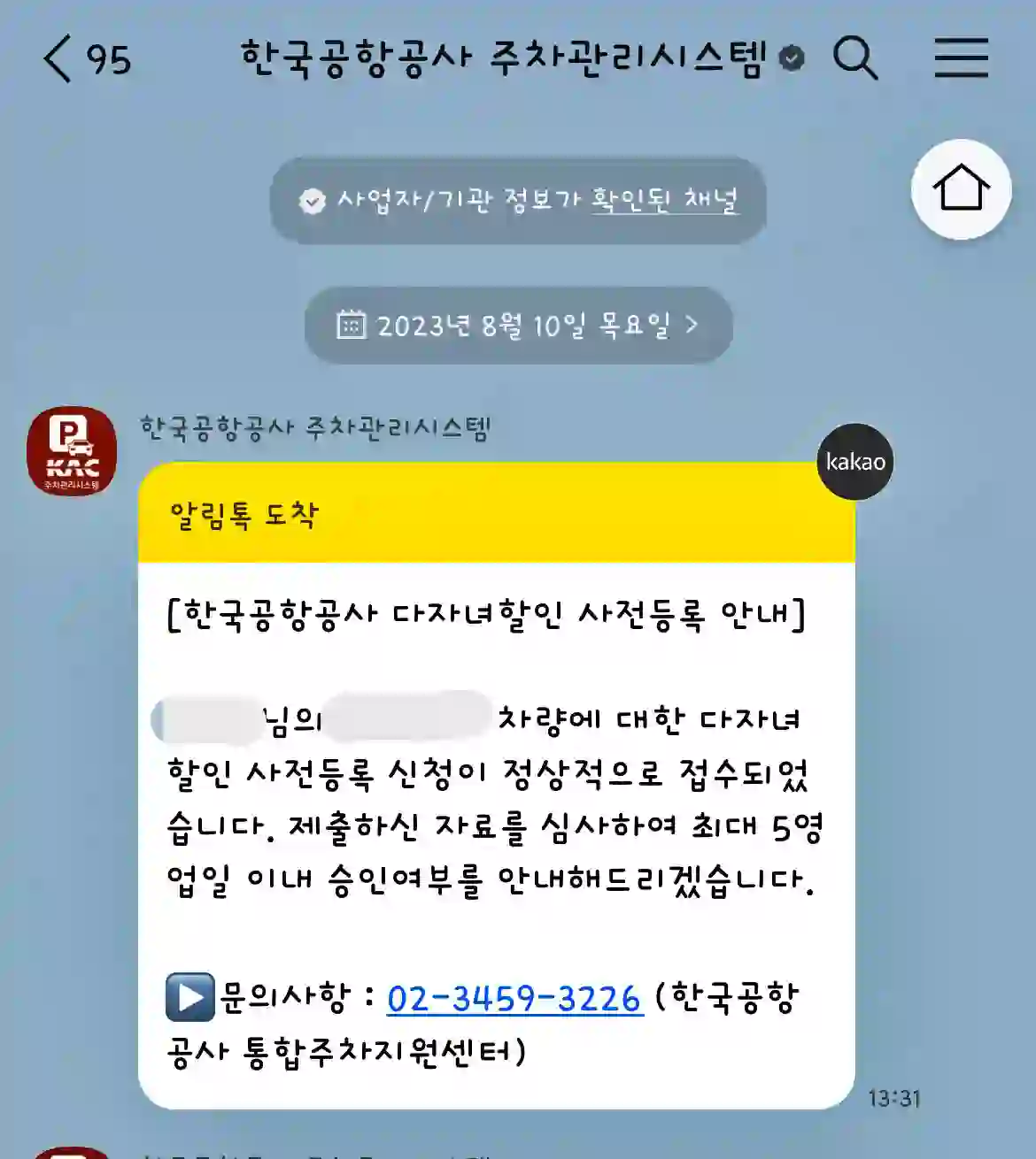 신청 후 카카오톡으로 메시지를 아래와 같이 받게 됩니다. 일정 시간이 지난 후에 " 한국공항공사 다자녀할인 승인완료 안내"라는 문자가 도착하게 됩니다. 이 메시지를 받았다면, 주차할인 50% 혜택을 받을 수 있게 됩니다.