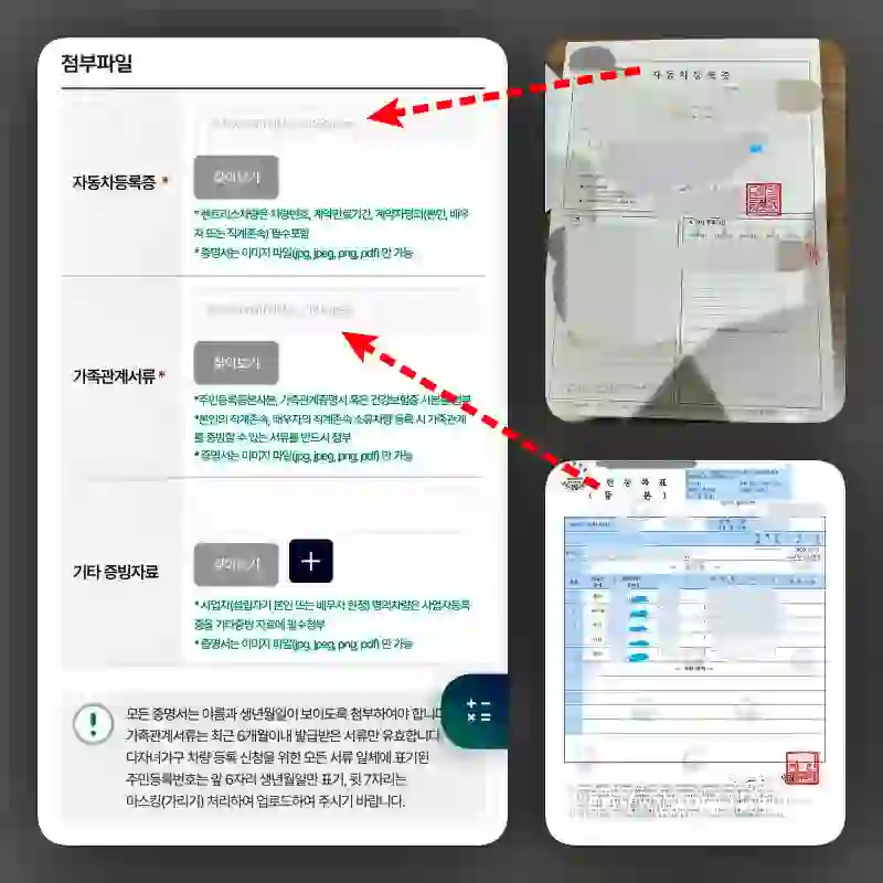 필요한 정보 입력 및 필요서류 업로드 (주민등록등본, 자동차등록증, 출차영수증 등)