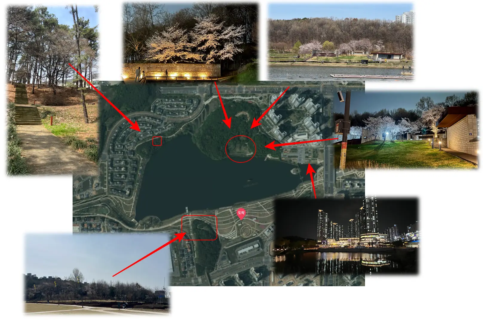아래 사진은 제가 다니면서 추천해 줄 만한 장소를 표시하였습니다. 아무래도 인위적으로 나무를 심은 곳보다는 기존 자연에 있던 나무들에서 뿜어져 나오는 느낌은 만들 수 없는 것 같습니다. 주말에 시간 되신다면 한 번쯤 방문 추천 드립니다.
