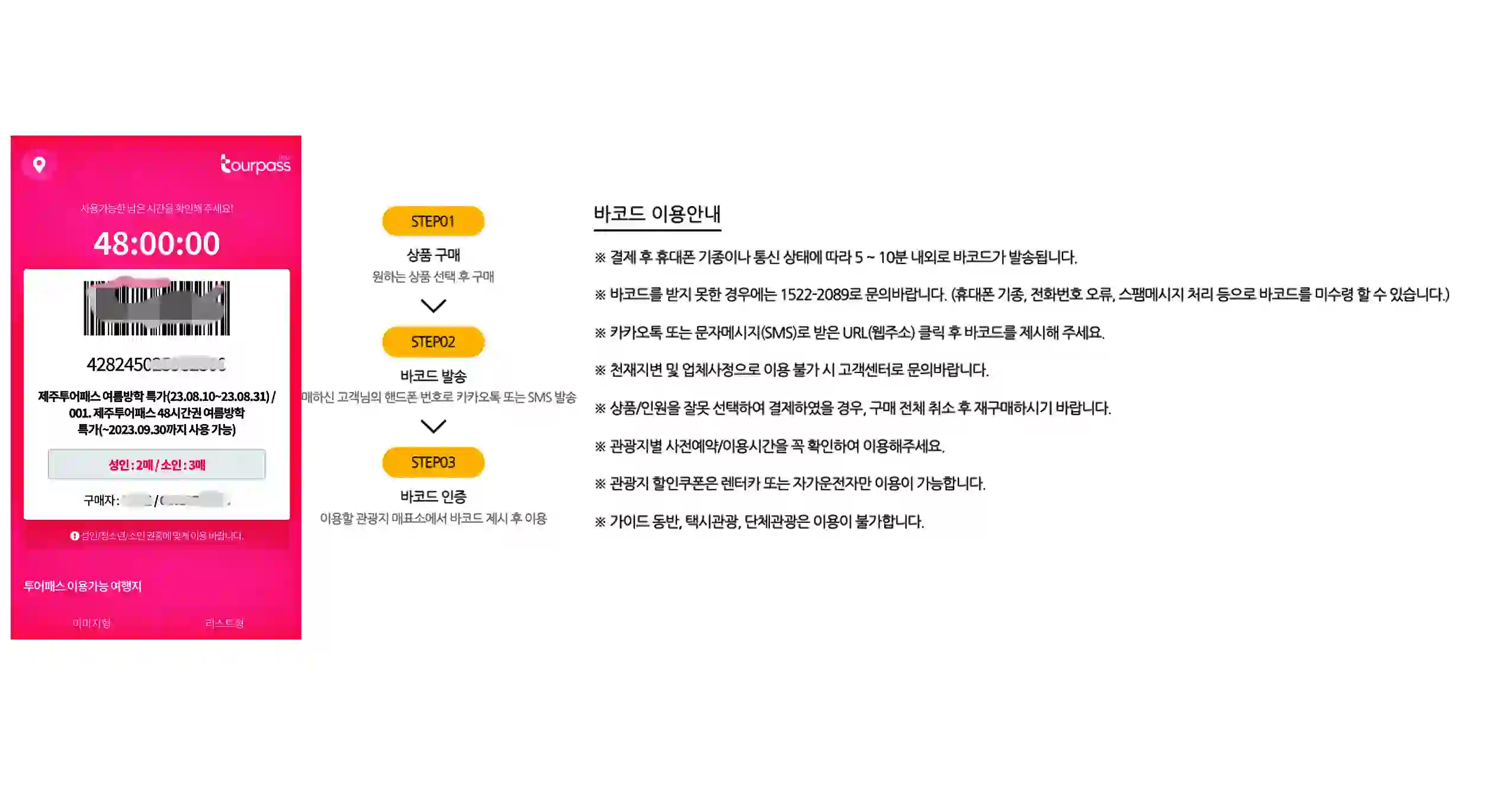 제주투어 패스 모바일 테켓 사이트 이용 예시 사진
