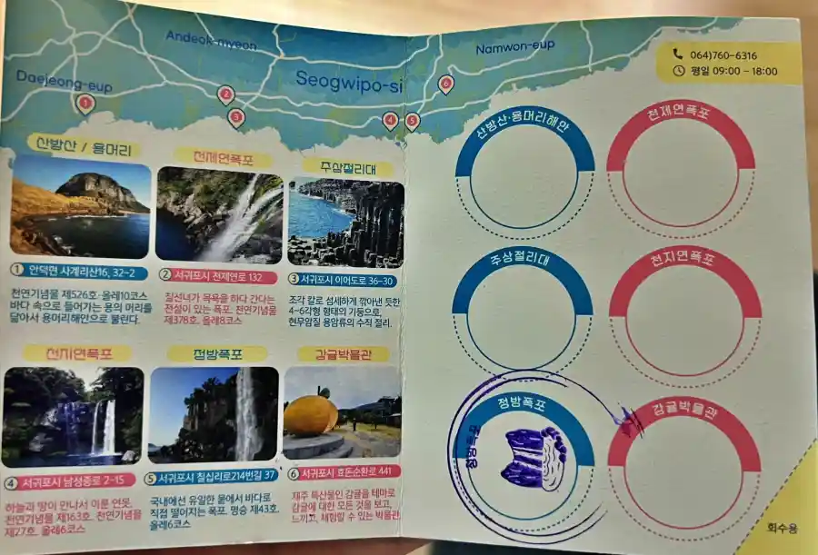 저희 가족은 천지연 폭포 방문 후 정방폭포로 이동하여 멋진 경관을 감상하였습니다. 서귀포시에서는 스탬프 투어도 진행 중이오니 가족과 함께 스탬프 투어 후 소정의 홍보물을 받아보시는 것도 좋은 추억을 만들 수 있을 것으로 보입니다. 스탬프 투어 종이는 아래 공영관광지 매표소에 가시면 무료로 받을 수 있습니다.