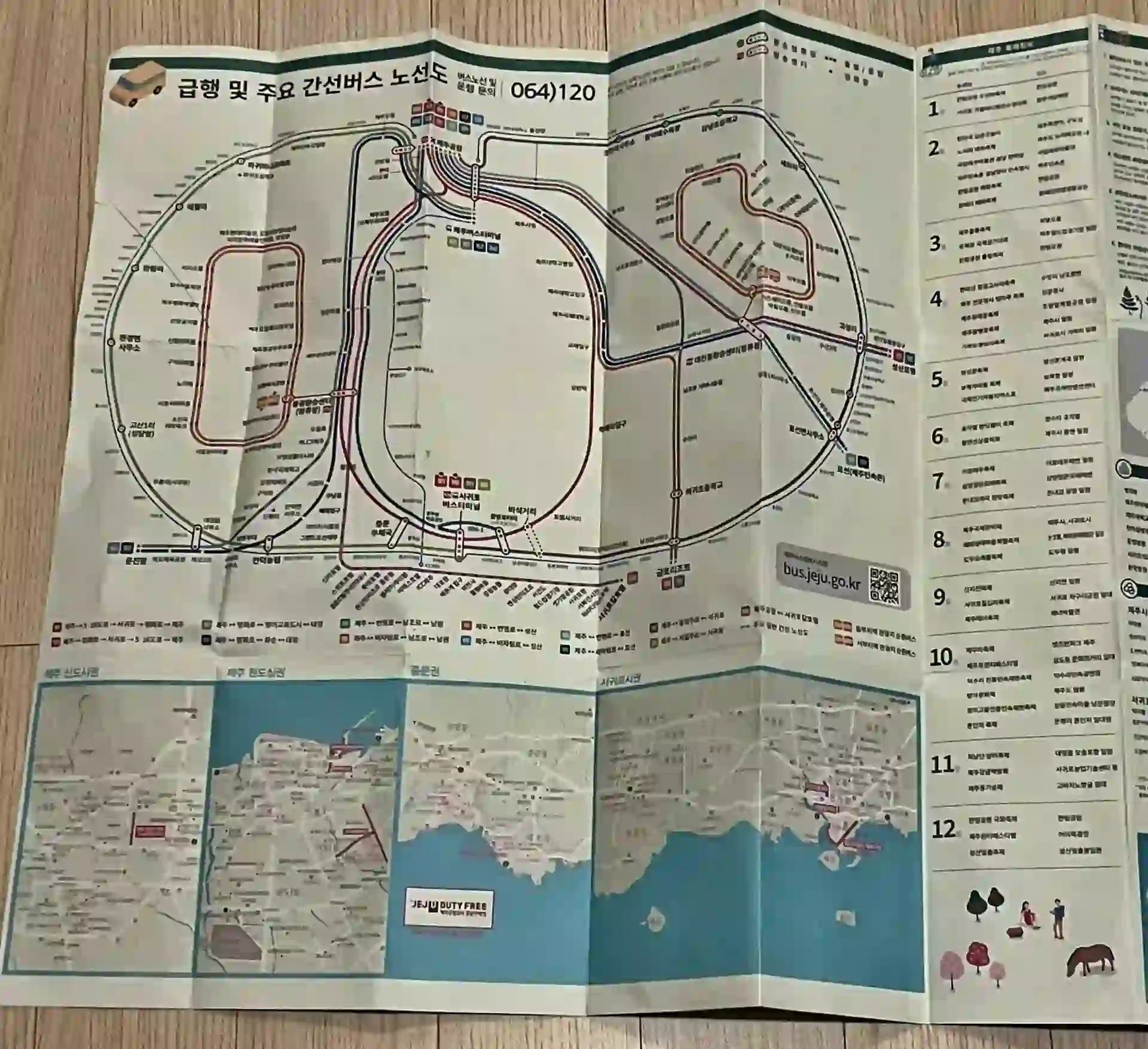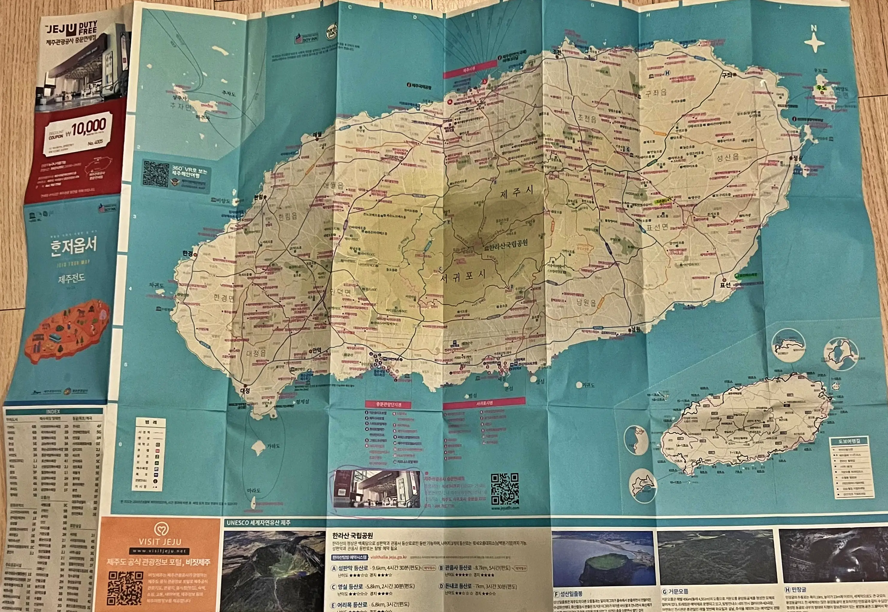 제주관광지도는 매우 자세하게 제주도의 주요 관광지와 도로를 정리해서 표시해 줍니다. 또한, 뒷면에는 대중교통 이용자들을 위해 버스 노선도도 포함되어 있어요. 지도만 보면 차 없이도 제주를 편하게 여행할 수 있습니다. 하지만, 저희는 아이들이 많으므로 앞면만 주로 활용할 것 같습니다.