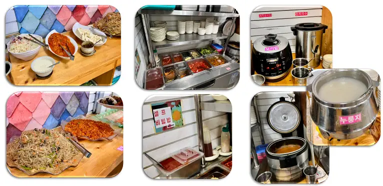 셀프 비빔밥 코너: 김치와 냉국, 쌈 채소와 함께 다양한 비빔밥 고명들이 준비되어 있습니다.